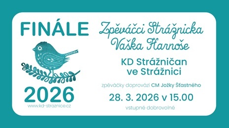Finále Zpěváčků Strážnicka Vaška Harnoše 2026 proběhne v neděli 28. března 2026. Zpěváčky doprovází CM Jožky Šťastného. Přijďte podpořit talentované děti, užít si krásné lidové písně a strávit příjemné odpoledne plné hudby a tradic. Vstupné je dobrovolné, takže vezměte své přátele a rodinu a přijďte se podívat na mladé talenty regionu!